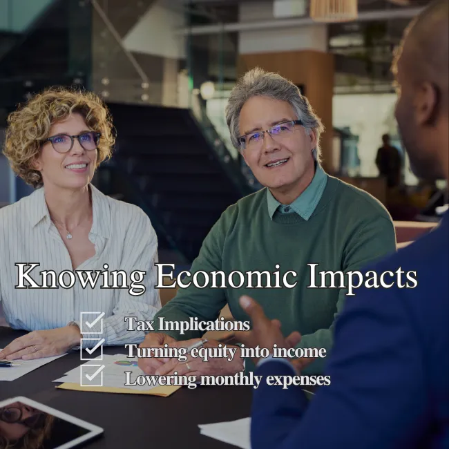 It's important to take the many financial implications into consideration to minimize the impacts of any potential negative results. As well as to be positioned to take advantage if the positive opportunities. Speaking with a Financial Advisor will help you turn your equity into income and guide you to minimizing any tax implications that could come with the sale of your home.